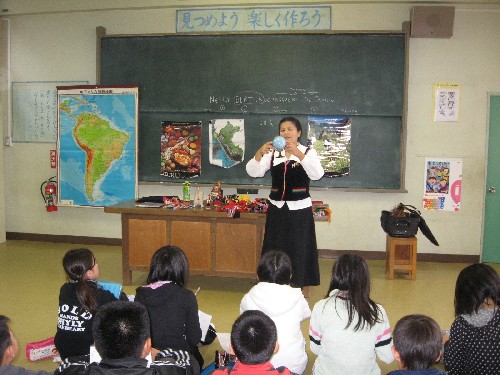 Peru is on the opposite side of the earth from Japan. The lecturer asked pupils “Do you know the Inca Empire?” She introduced the world heritages in Inca, Peruvian culture and food.