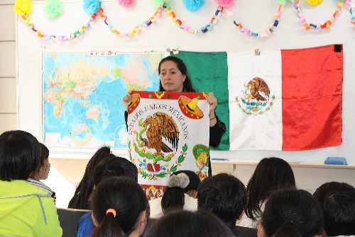 Showing colored pamphlets, pictures, cloths, and the national flag of Mexico, the lecturer introduced Mexico in full of facial expression.