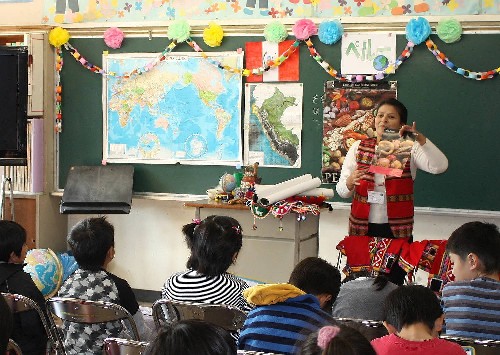 The beautiful Peruvian costumes, game properties and musical instruments were introduced and the schoolchildren showed an interest in each.