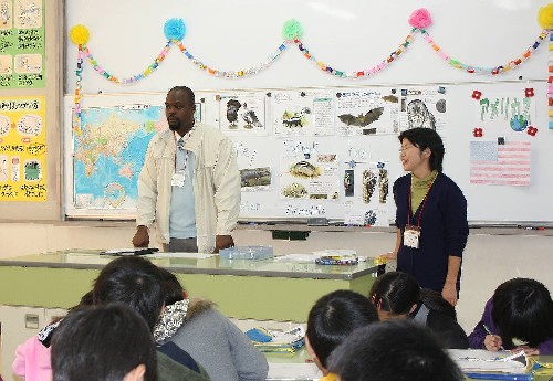 The international education program in Yamazaki elementary school was held on Thursday, November 24, 2011, to find the difference between foreign country and Japan, and that there are a lot of way of thinking and sense of values, through exchange with foreign lectures. Three foreign lecturers from three countries (Malaysia, Hong Kong, and Peru) were invited and three NIA staffs joined. Yamazaki elementary school was founded in 1980. It has 12 classes, 377 pupils in total. This time, 3 classes, 60 fifth-grader pupils attended the program.