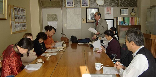The lecturers and the persons concerned held a preliminary meeting to make arrangements about the agenda in the principal’s office.