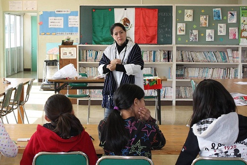 In the latter half of the class, listening to the cassette Mexican music, the pupils sat in a circle and got interested in children’s dolls and toys shown.