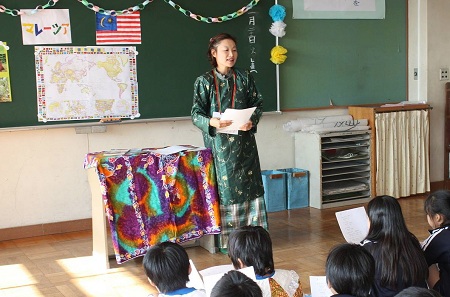 Showing the map, the lecturer introduced Malaysian culture, language, and industry. She explained that the weather of Malaysia was mild all the year, and there were a lot of Japan’s overseas enterprises in Malaysia. The pupils practiced speaking some basic greeting words (thank you, good afternoon, good bye, etc.) in Malaysian language.