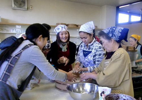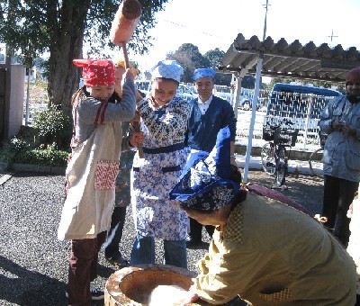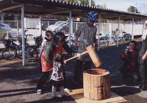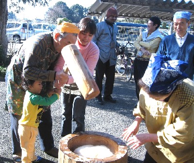 In the open air, foreign people (China, the Philippines, and India) and their children, the citizens of Noda city and their children experienced rice-cake making by use of mortar and pestle.