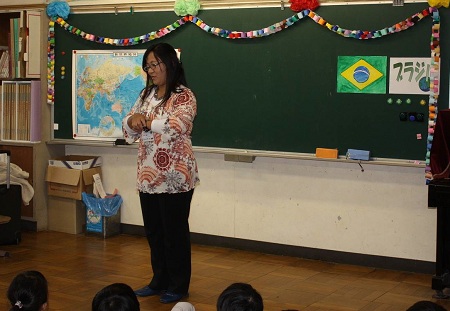 The international education program in Yamazaki elementary school was held on Thursday, November 24, 2011, to find the difference between foreign country and Japan, and that there are a lot of way of thinking and sense of values, through exchange with foreign lectures. Three foreign lecturers from three countries (Malaysia, Hong Kong, and Peru) were invited and three NIA staffs joined. Yamazaki elementary school was founded in 1980. It has 12 classes, 377 pupils in total. This time, 3 classes, 60 fifth-grader pupils attended the program.