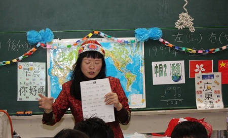 The pupils practiced speaking some simple greeting words (good morning, good afternoon, good bye, thank you, etc.) in Cantonese.
