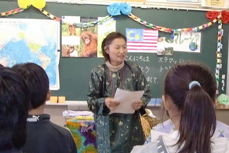 Showing the map, the lecturer introduced Malaysian culture, language, and industry. She explained that the weather of Malaysia was mild all the year, and there were a lot of Japan’s overseas enterprises in Malaysia. The pupils practiced speaking some basic greeting words (thank you, good afternoon, good bye, etc.) in Malaysian language.
