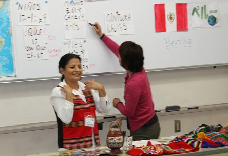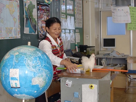 The lecturer began by asking “Where is Peru on the globe?” and “How long does it take from Japan to Peru?” The answers were various. The pupils were attracted to hear that Peru is on the opposite side of the earth from Japan and it will take about 23~28 hours by plane. Peruvian song in gymnastics and vivid handy-crafts were introduced, and the pupils showed an interest in each.
