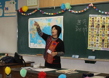 The pupils attentively got explanations of the national flag of Thailand, Thai language, and the weather of Thailand. They were taking notes on the form “interchange class open to the world” that the lecturer handed out.