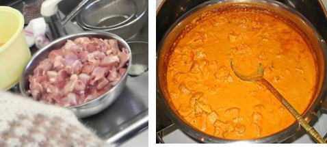①Cook chopped onion, garlic and ginger in oil. Boil chicken or mutton well.