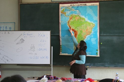 Showing the map, the lecturer introduced Peru to the schoolchildren.