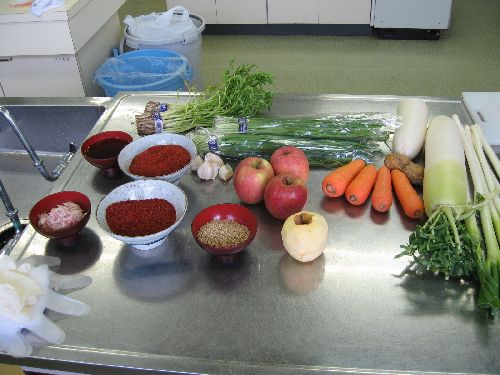4 bulbs of Chinese cabbage, 1 Japanese radish, 3 Welsh onions, 4 apples, 3 carrots, a bundle of Japanese parsley, 3 bundles of leek, 2 bulbs of ginger plant, a cup of salted opossum shrimp, a half cup of sesame, a cup of fish sauce, 3 and a half cups of chili powder, 2 bulbs of garlic, salt 200g, a cup of water, 3 cups of hot waterMs. Kasai began to give us instructions.