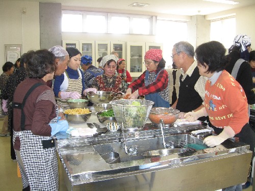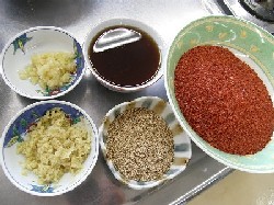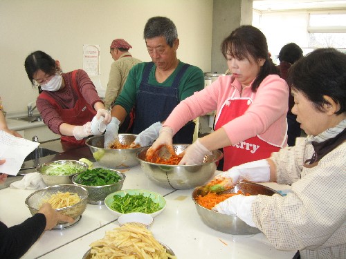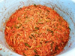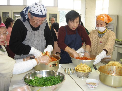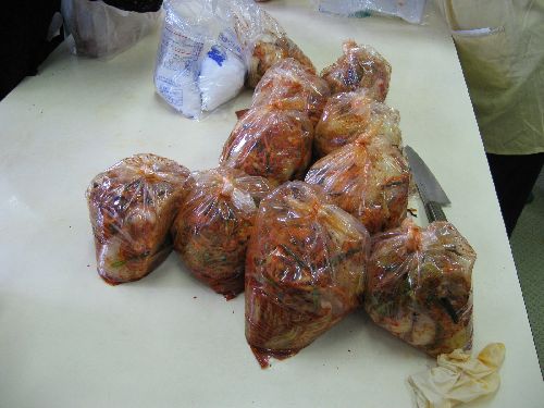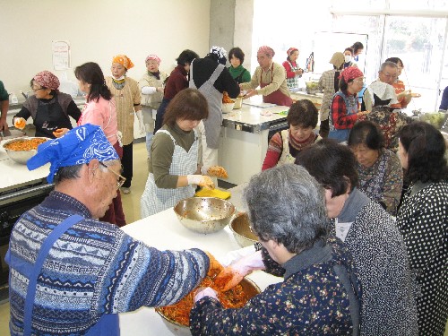 Chinese cabbages were preserved in salt from Saturday afternoon and Kimchi were made on Sunday.