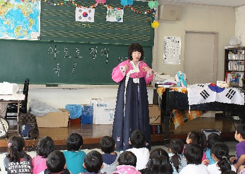 The lecturer explained that Korean people wrote their own name like this in Hangul. The pupils were listening to the lecturer interestingly.
