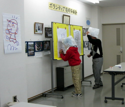Hukuwarai game (a funny face game) that we put a white bag over head and draw a picture of the face.