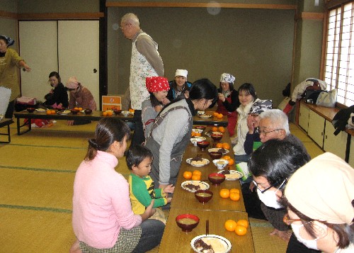 The menu is rice-cake with bean jam, rice-cake with soybean flour, rice-cake with grated radish, Kenchin soup, and mandarin oranges.